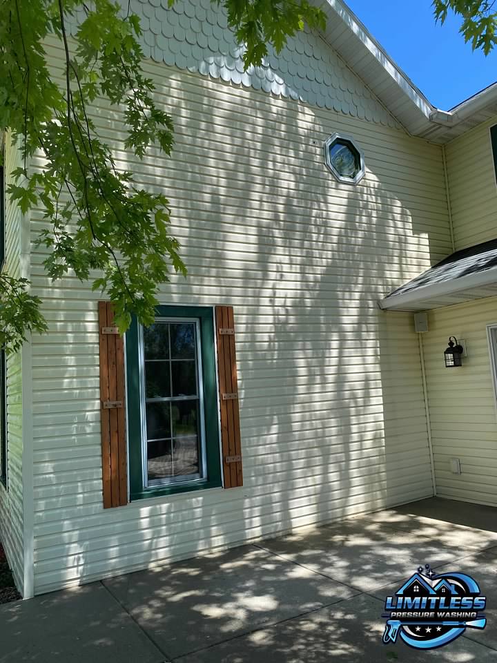 We just wrapped up a house washing project in Evansville, WI, and the result was amazing! This home had built up layers of dirt, algae, and mildew over time, leaving the siding looking dull and discolored. Using our gentle soft washing technique, we safely removed all the grime, restoring the home’s exterior to a fresh, like-new appearance—without causing any damage.